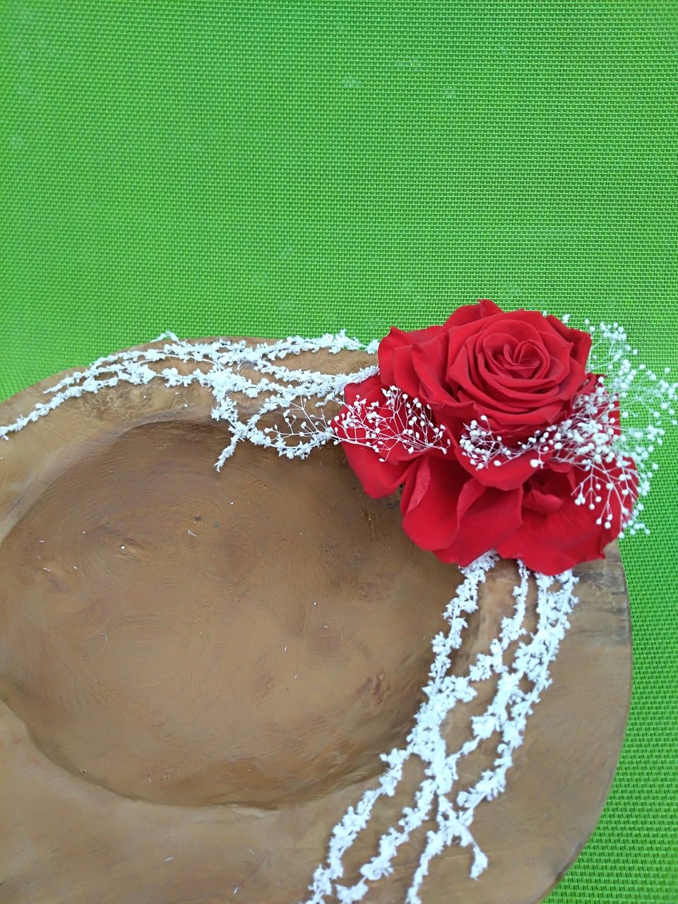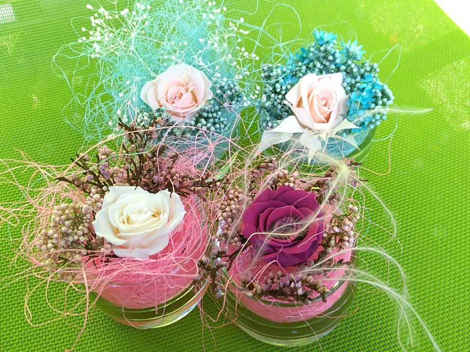 Les compositions sont réalisées en fleurs stabilisées (roses éternelles délicatement parfumées).